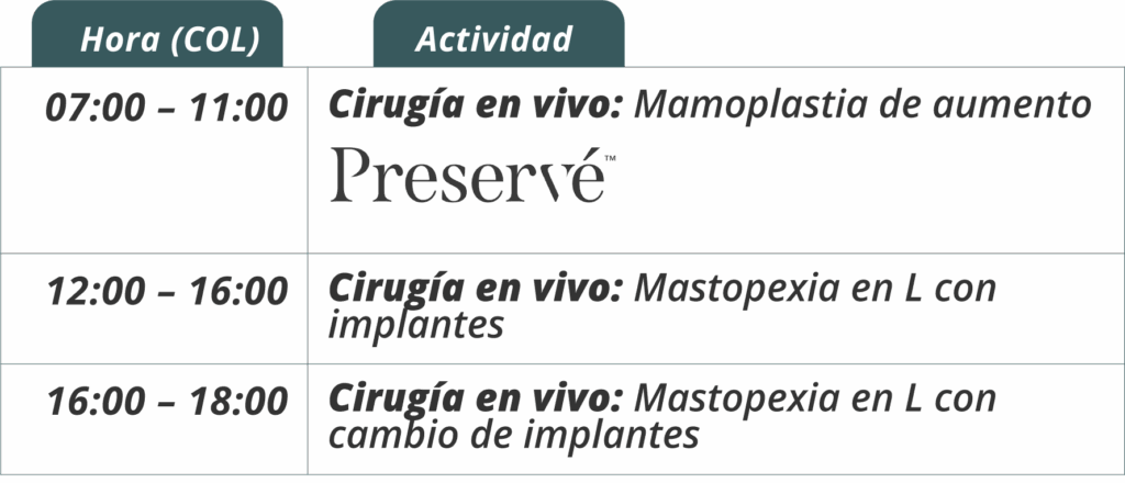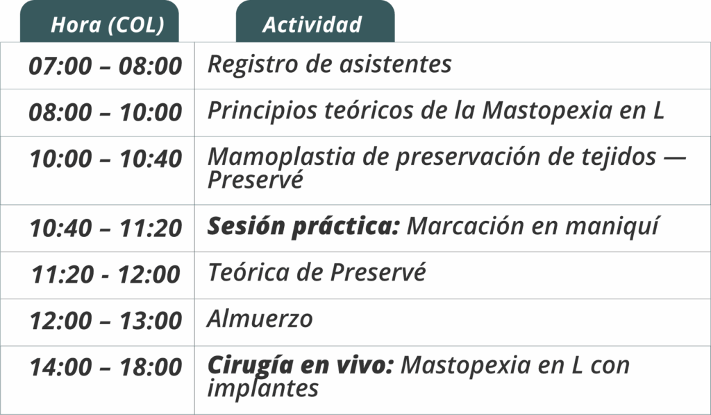 Combinaremos los conceptos más actuales en cirugía mamaria como: Banda muscular Lateral, Brassier interno, Dual plane customizado, HC Bra, Grip Plane y por supuesto, Mastopexia con cicatriz en L. Serán dos días en una inmersión 100% personalizada, hands on con 4 cirugías en vivo además de un completo módulo teórico.